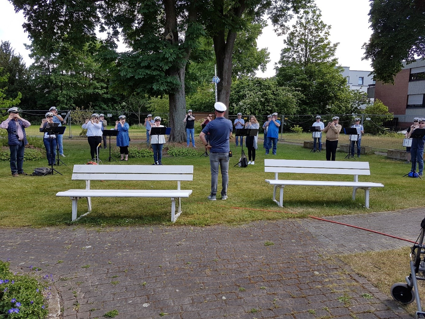 3 Generationen eines Ehepaares des Jakobi Altenzentrums sind seit vielen Jahren Mitglieder bei den blauen Jungs. Aus diesem Grunde haben sich die Mitglieder des Spielmannszuges gedacht dem Jakobi Altenzentrum etwas Gutes zu tun und für die Bewohner im Park zu spielen.